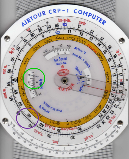 Now we have both Pressure altitude and actual temperature, we can use the whizz-wheel to do the calculation to convert indicated altitude to True Altitude: